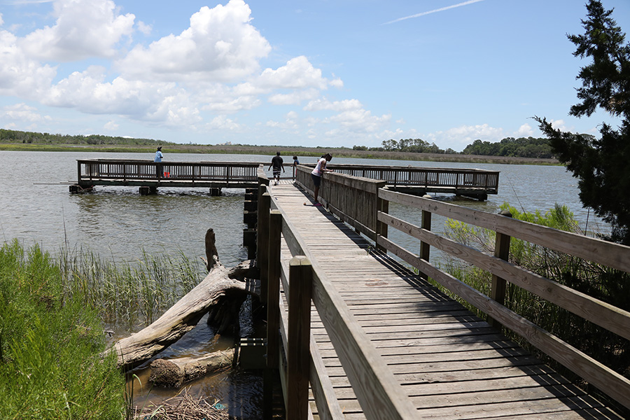 Fishing or crabbing is permitted from the provided piers and from any safely accessible banks. There are no stations with running water for cleaning catches, however, so cleaning fish or crabs is not allowed on the fishing piers, nor is it allowed in any restrooms, pavilions or elsewhere on these properties. Fishers or crabbers are responsible for the safe and considerate disposal of all bait, broken lines or hooks, and any other discarded material that can be harmful to wildlife and unappealing to others if not properly disposed of.