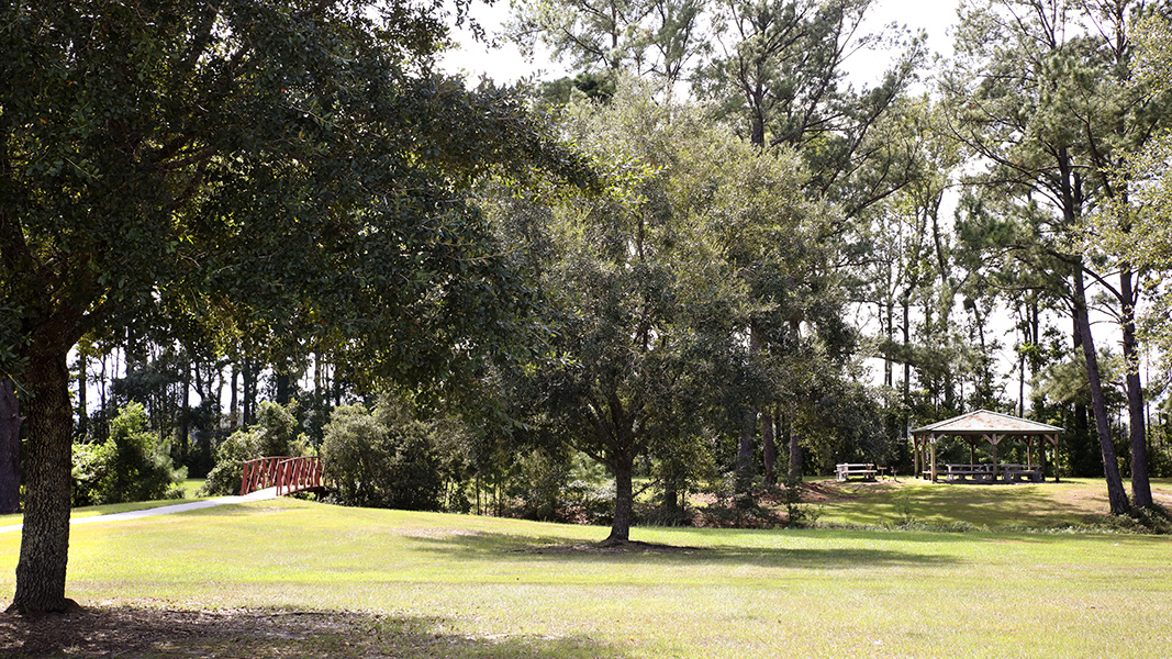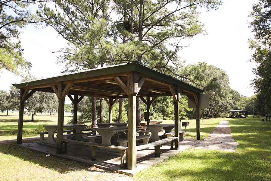Central to the park is a large fresh water lake, stocked with bass and bream for fishing during daylight hours. A paved one mile walking path and exercise course surrounds the lake, also providing access for fishing from multiple points around the lake. A boat ramp enables small, non-gaspowered craft access to put out onto the water for deeper fishing.
