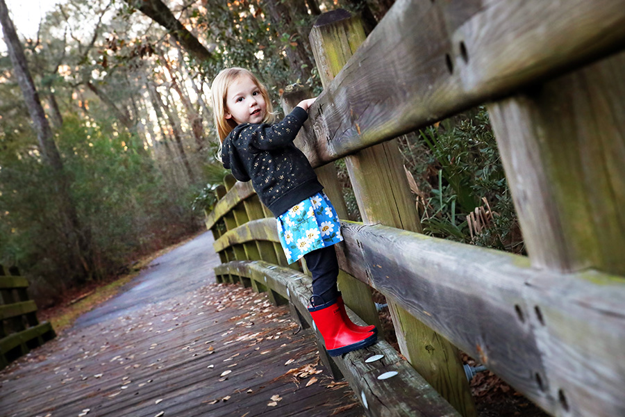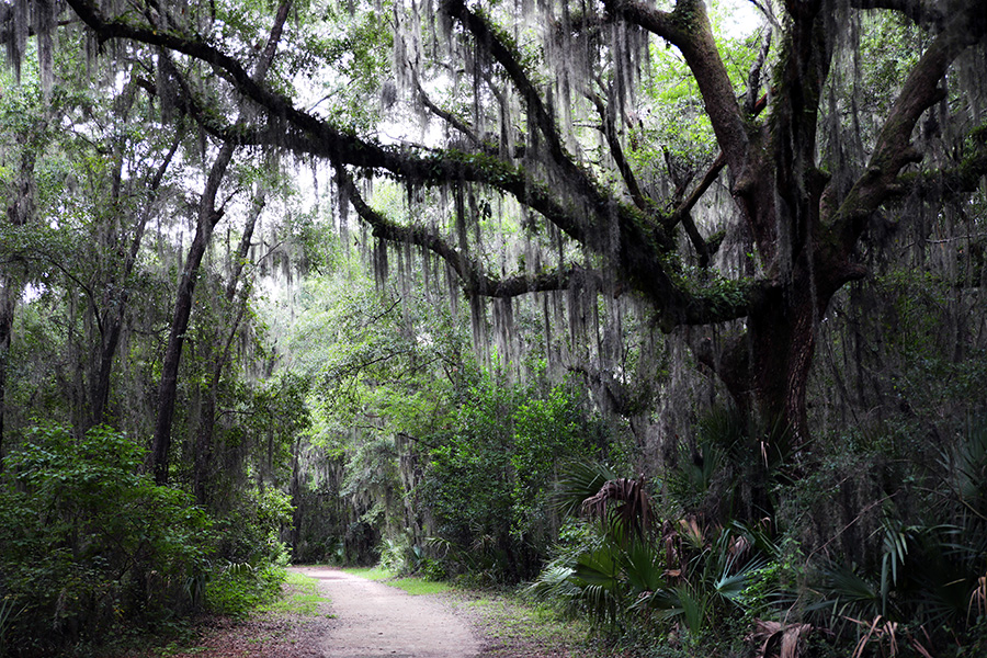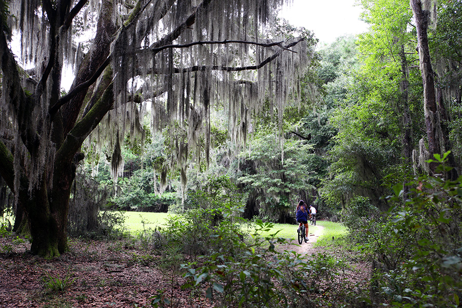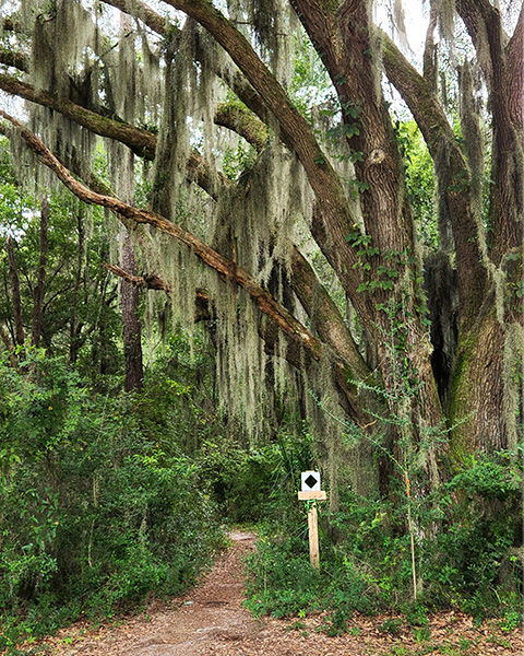 Old-growth woods have been cut through with numerous leafy paths marked with curious names like ‘Stardust’ and ‘Sadsack’, ‘Backyard Bash’ and ‘Retirement Plan’, not to mention ‘Fart Swamp’. Nicely maintained, long wooden walkways bridge low-lying watery areas, and shaded trails where nature blooms and buzzes. (Bug spray is recommended.) An overview of the preserve’s trails posted at the Johnny Mercer entrance to the preserve includes a QR code that will allow you to pull up the same map on your cellphone for reference as you go.