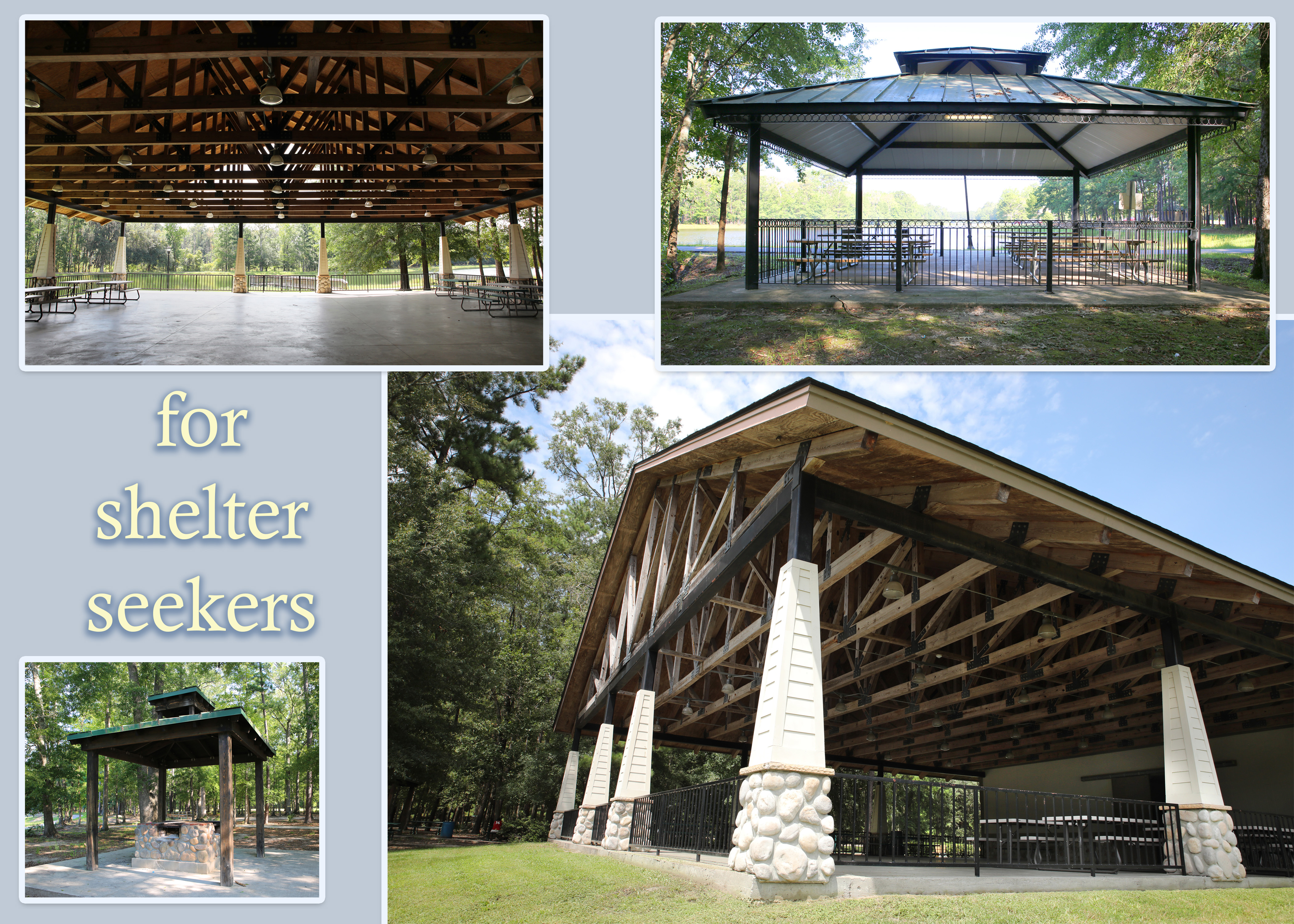 The open-air shelters of Tom Triplett Park can also be destinations in their own right, for little lunches, picnic parties, or grand gatherings. The smallest have tables, benches, and grills for cooking out. The largest is the huge and handsome vaulted pavilion, spacious enough for dozens of guests with room to spare. Great stone and wood pillars on three sides of the pavilion are widely spaced to frame views out to the lovely lake and the nearby activity areas and to allow breezes to play through. The exposed crisscross rafters support a massive ceiling that provides light and shelter for private or public happenings such as ceremonies or receptions, family reunions, crafts fairs or workshops, youth programs, Zumba classes, or County-sponsored community service events. The pavilion also has a separate, enclosed meeting room well-suited for club meetings, programs, or meals.